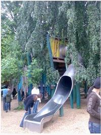 Kleinkindbereich, Kletterbereich, Sand-/Wasserspielbereich, große Bäume